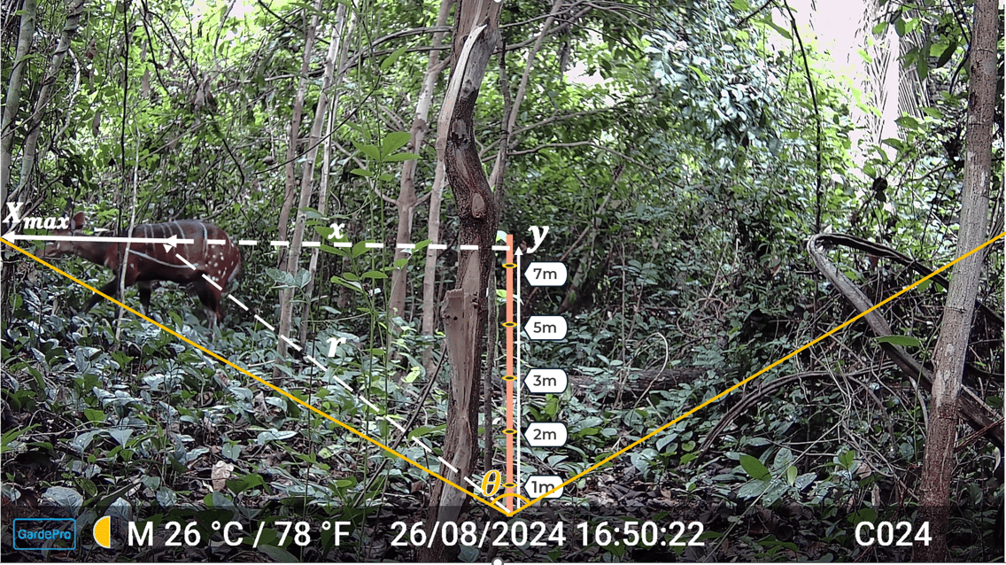 When an animal triggers a camera, two key measurements are needed: the radial distance from camera to animal, and the angle of detection relative to the camera’s central axis. These measurements must be recorded at regular time intervals (the parameter t discussed earlier) for as long as animals remain within the viewshed. If an animal walks past the camera, for instance, multiple distance measurements at 0.5-second intervals might yield 20 or more data points from a single detection event.
